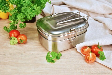 Celonerezový EŠUS 2v1 se skládá ze dvou samostatných pater (450 ml + 550 ml), je nerozbitný, odolný a ideální na obědy i svačiny. Díky sklápěcímu držáku se dobře přenáší a umožňuje i ohřev. Opakovaně použitelný – ekologická volba pro každý den.