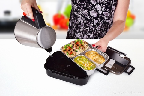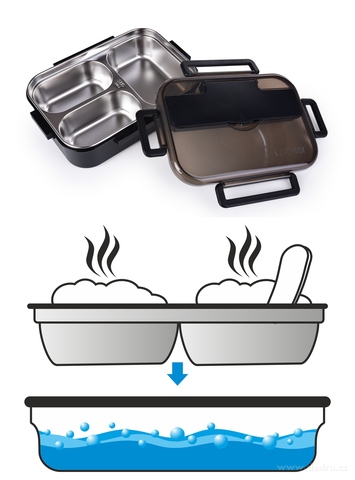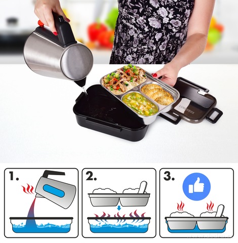 2) Do plastové spodní nádoby nalej trochu teplé vody z rychlovarné konvice. Stačí jen trochu, aby voda nepřetekla! Pak vlož nerezové plato s jídlem a počkej chvilku, než se pokrm prohřeje. V tomto případě dej pozor při přenášení a ber ohled na teplou vodu v BENTO BOXU. Opět platí, že nerez rozvádí teplo velmi rychle.