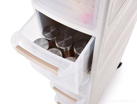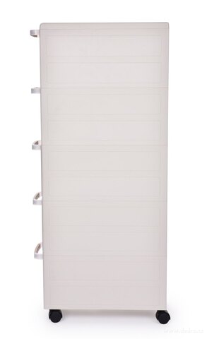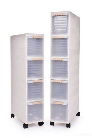 Pojízdný regál s transparentními zásuvkami, 5 šuplíků (rozměr cca: š 15 x h 42,3 x v 16,5 cm). Vyrobeno z pevného plastu.