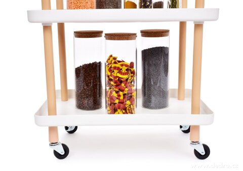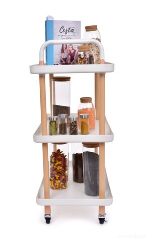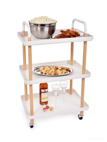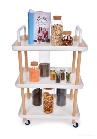 TROLLEY 3patrový pojízdný vozík s obdélníkovými policemi, výška 86 cm, bílý. Robustní konstrukce, 4 kolečka s brzdou a pevná madla. Praktický do kuchyně, koupelny, obývacího pokoje i na servírování.