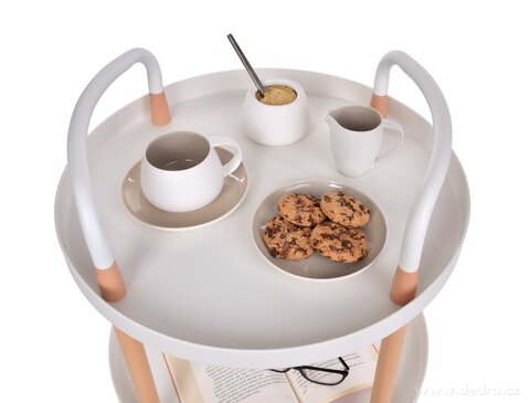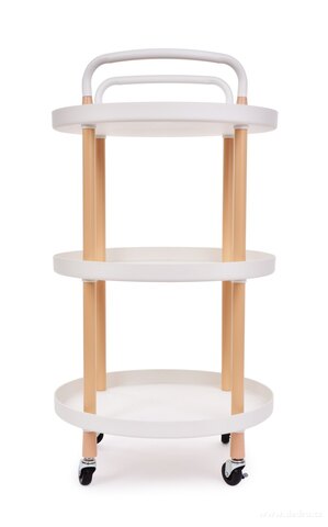 TROLLEY 3patrový pojízdný vozík s výškou 86 cm a kulatými policemi. Robustní konstrukce, 4 kolečka s brzdou a pevná madla. Využijete v kuchyni, koupelně, obývacím pokoji i na servírování občerstvení.