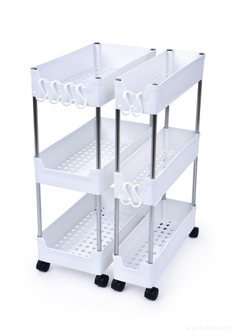 Pojízdný regál do úzkých prostor se 4 odnímatelnými háčky na pověšení a 4 pojezdovými kolečky pro snadnou manipulaci. Kombinace kovu a plastu. Hloubka 39 cm, 3 patrový.