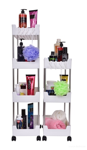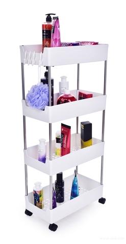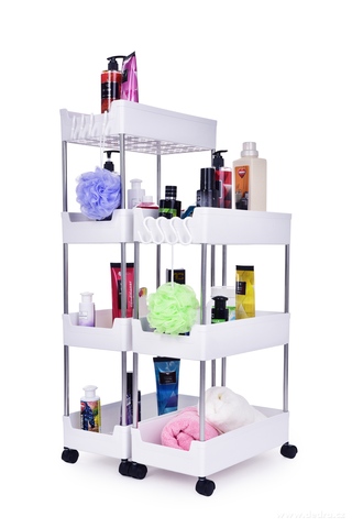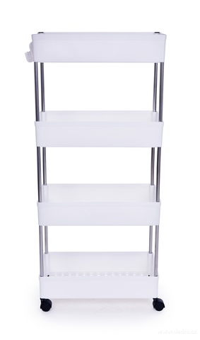Pojízdný regál do úzkých prostor se 4 odnímatelnými háčky na pověšení a 4 pojezdovými kolečky pro snadnou manipulaci. Kombinace kovu a plastu. Hloubka 39 cm, 4 patrový.