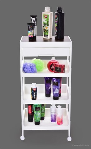 Pojízdný regál/stolek se 4 kolečky, ve vrchní části odnímatelná dřevěná polička a šuplík.