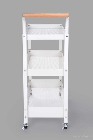 MULTIFUNKČNÍ POJÍZDNÝ VOZÍK/regál, 3 patrový, se 4 kolečky a dřevěným madlem pro snadnou manipulaci. Perforované dno košíků pro snadné odvětrávání. Materiál: kov a dřevěná rukojeť. Rozměry: š 30 x h 51 (s rukojetí 57 cm) x v 93 cm (mezi poličkami 33 a 28 cm).