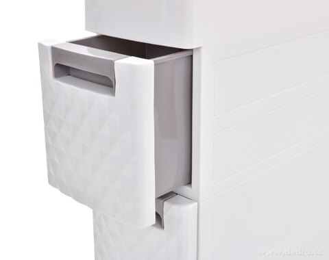 Pojízdný regál do úzkých prostor se 2 šuplíky a dvěma poličkami, ve spodní části 6 pojezdových koleček pro snadnou manipulaci. Kombinace kovu a plastu. Rozměry: š 18 x h 45 cm. šíře 18 cm, výška 91 cm