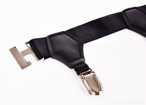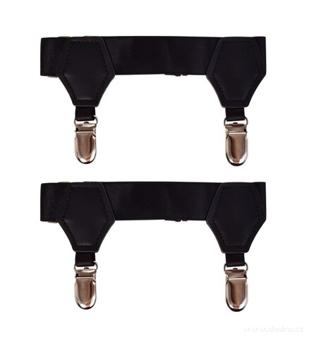 2 ks ponožkové podvazky s upínacími klipy, nastavitelné. Materiál guma, kov a eko kůže.