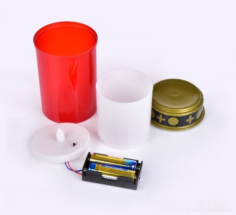 jemně problikává červeným mihotavým světlem, které věrohodně napodobuje klasickou svíčku