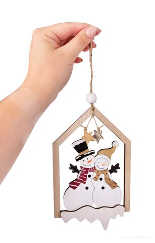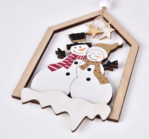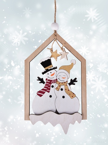 Dřevěná závěsná dekorace SNĚHULÁKOVÝ DOMEČEK s roztomilým párem sněhuláků, hvězdami a přírodním provázkem vnese do domova zimní pohodu a radost. Výška 16 cm, ideální na stromek, dveře i okna.