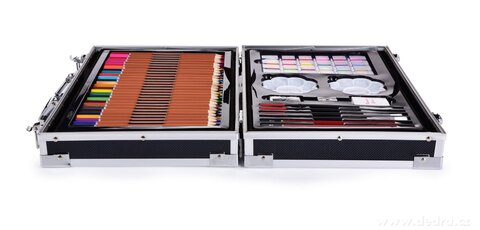Kompletní sada uměleckých potřeb v elegantním rozkládacím kufříku se čtyřmi patry. Ideální pro děti, studenty i dospělé tvůrce – na doma, do školy i na cesty. Kufřík má pevný kartonový povrch s kováním po celém obvodu, dva kovové klipsy a madlo na přenášení.