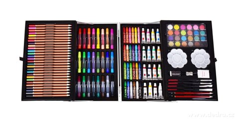 ART | 142dílná sada uměleckých potřeb v rozkládacím kufříku se 4 patry. Obsahuje pastelky, fixy, olejové a vodové barvy, barvy v tubě, štětce, palety, ořezávátko a další pomůcky. Pevný kufřík s kováním, ideální na doma i na cesty. Pro děti i dospělé.