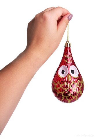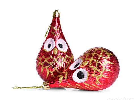 Roztomilé vánoční ozdoby VYKULENÉ SOVIČKY v červeném lesklém provedení se zlatými třpytkami. Sada 2 ks o výšce 12 cm přidá vašemu stromečku hravost, šarm a originální kouzlo.