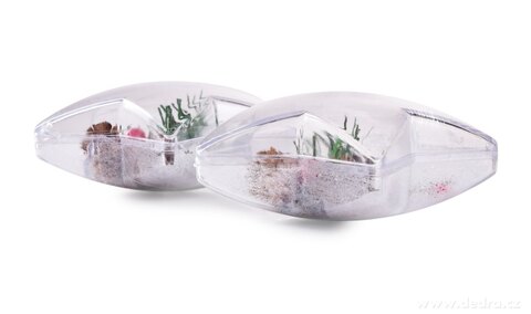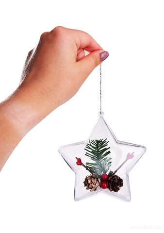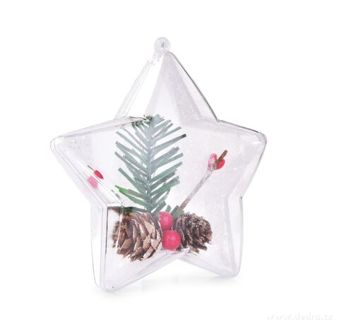 Sada 2 transparentních hvězd s vnitřní dekorací z větviček, šišek a bobulek. Elegantní přírodní ozdoba na vánoční stromek i do aranžmá. Velikost 10 cm.