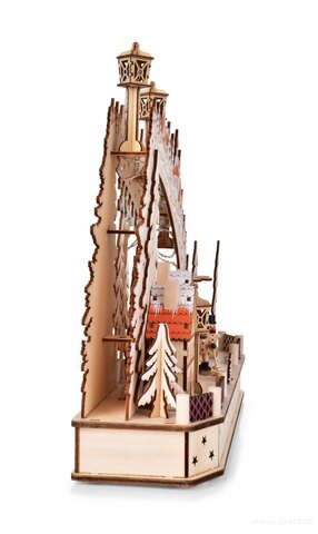 Dřevěná detailně propracovaná dekorace. Rozměry: š 45 x h 11 x v 33,5 cm. Napájení na 3 tužkové baterie 1,5 V AA (není součástí balení)