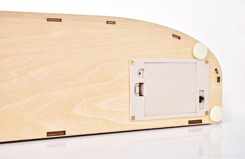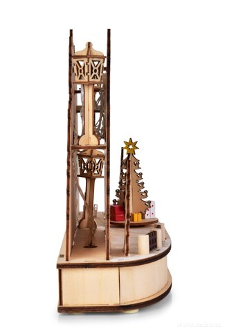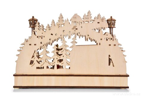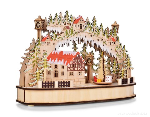 Dřevěná detailně propracovaná dekorace. Rozměry: š 35 x h 10 x v 23 cm. Napájení na 3 tužkové baterie 1,5 V AA (nejsou součástí balení)