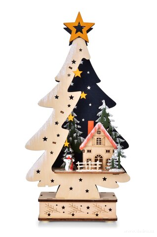 Dřevěná dekorace ve tvaru vánočního stromku skrývá zasněženou chaloupku, sněhuláka a svítící LED osvětlení. Výška 40 cm. Jemné detaily a přírodní provedení přinášejí do domova harmonii a atmosféru tradičních Vánoc.