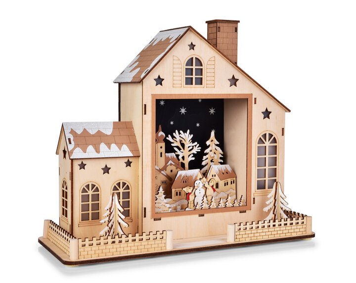 Dřevěný svítící domek ukrývá poetickou zimní vesničku zalitou teplým světlem. LED dekorace o šířce 35 cm vytváří pocit bezpečí, domova a dětského štěstí. Detailně propracované zátiší rozzáří každý interiér a přinese do něj kouzlo svátečního období.
