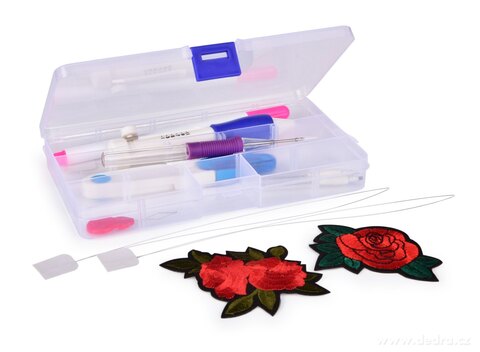 Vyšívací box s vyšívacím perem, technika vpichování dutou jehlou, PUNCH NEEDLE, praktický plastový box, uvnitř rozdělen na několik částí.