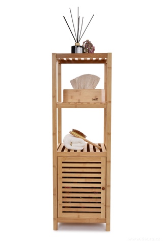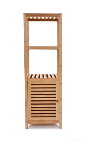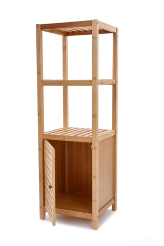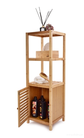BAMBUSOVÝ REGÁL s policemi a dvířky ve spodní části.