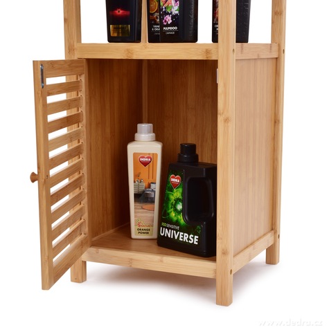 BAMBUSOVÝ REGÁL s policemi a dvířky ve spodní části.