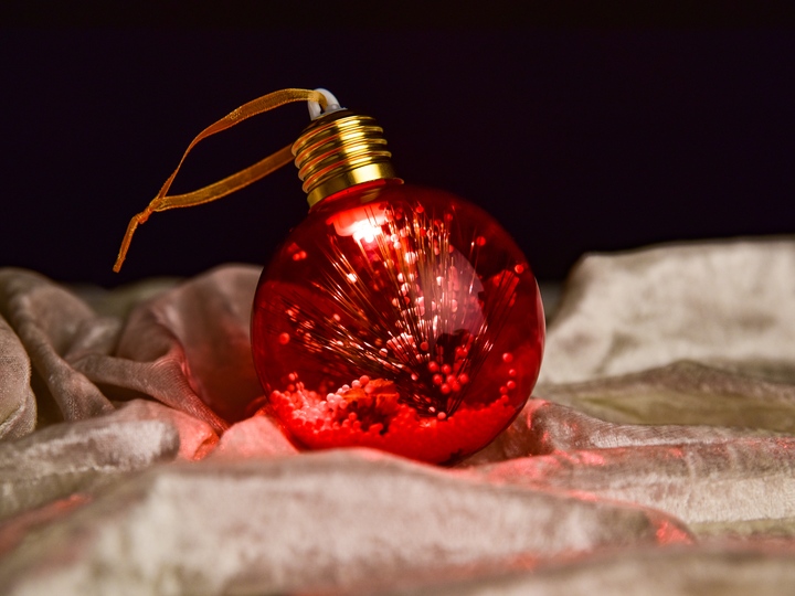 Červená LED koule s vnitřní přízdobou vytvoří teplou, vánoční atmosféru plnou pohody. Svítí jemným světlem, má originální design a uvnitř ukrývá jehličí s dekorativními kuličkami. Průměr 7,8 cm. Baterie jsou součástí.