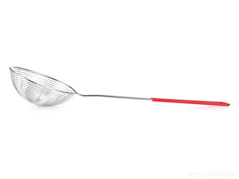 Fritovací nerezový cedník/naběračka se silikonovou úpravou na rukojeti. Materiál nerezová ocel a silikon. Délka 31,5 cm, průměr 9,5 cm.
