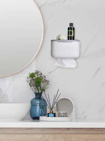 Praktická skříňka PRAKTIK na kapesníky a ubrousky s možností zavěšení na zeď nebo postavení. Elegantní organizér do koupelny, toalety či kuchyně, který šetří místo a umožní odkládání drobností na horní plochu.