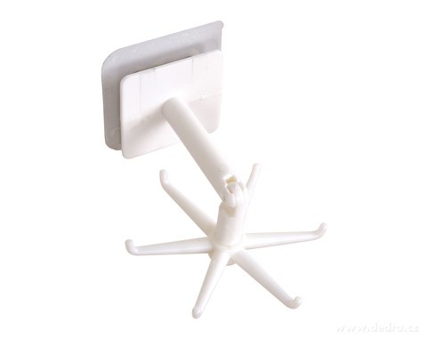 Závěsný kolotoč se 6 otočnými háčky na lepicí podložce umožňuje přehledné uložení kuchyňského náčiní, šperků nebo klíčů. Vyroben z pevného plastu, snadná instalace bez vrtání. Kompaktní řešení pro zavěšení drobností v kuchyni, koupelně či předsíni.