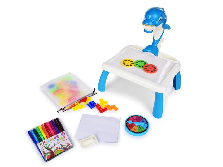 Zábavný delfín 2v1 – projektor na kreslení a logická hra s barevnými kostkami v jednom. Díky promítání obrázků děti snadno obkreslí a vybarví výkres. Pro rozvoj kreativity i logického myšlení. Pro děti od 3 let. Napájení 3× AA (nejsou součástí).