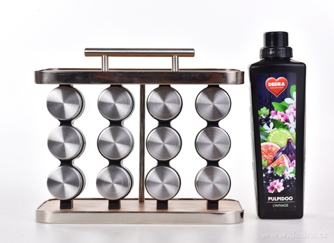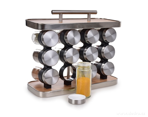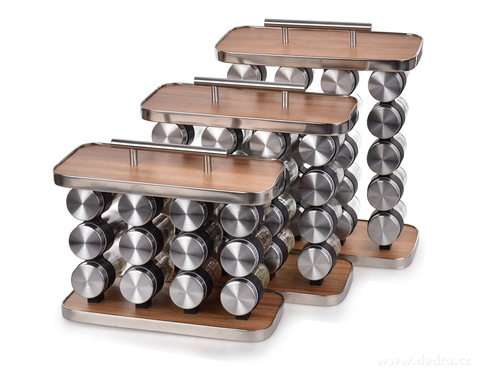 Stojan na koření SPICE TOWER, vyrobeno z MDF s dezénem dřeva, nerezové oceli a odolného plastu se skleněnými kořenkami. Stojan: š 28 x h 12 x v 20 cm (23 cm s úchytem), kořenka: průměr cca 4 cm x výška 9,7 cm (objem jedné dózy cca 90 ml).