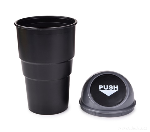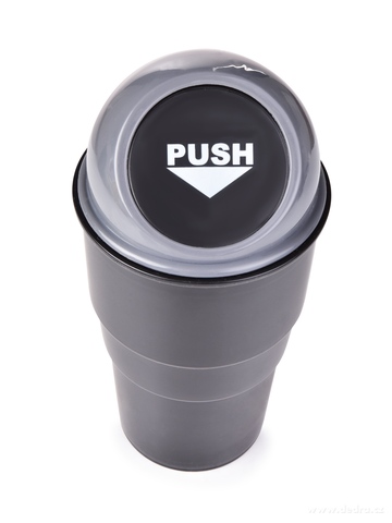 Odpadkový koš DRIVE do auta s PUSH víkem a objemem 670 ml. Pasuje do držáků na nápoje, praktický pomocník pro čistý interiér bez drobků, účtenek a papírků.