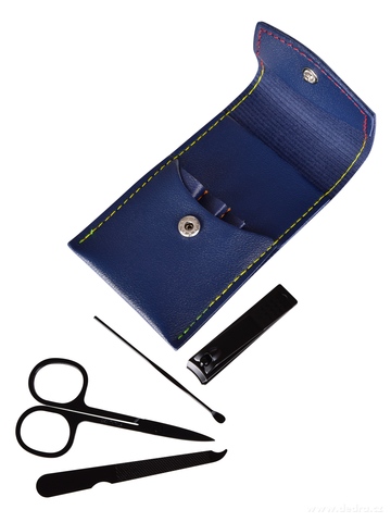 Elegantní 5dílná cestovní manikúrová sada z nerezové oceli v tmavě modrém pouzdře z eko kůže. Obsahuje kleštičky, nůžky, pilník, škrabátko a pouzdro se zapínáním na patent. Praktická velikost 7 × 10 cm, ideální na cesty i jako dárek.