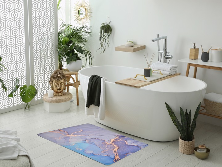 Ultrasavá koupelnová předložka SPA v designu modro-zlatého mramoru absorbuje vodu během několika sekund a rychle vysychá. Je vyrobena z přírodní křemeliny s antibakteriálními vlastnostmi, která zabraňuje množení bakterií i vzniku nepříjemného zápachu. Protiskluzová spodní část z přírodního kaučuku zajistí stabilitu i na mokré podlaze. Díky menšímu formátu 50 × 80 cm se hodí i do menších koupelen či kompaktních prostor.