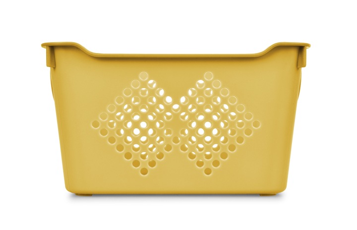 Perforovaný úložný box s uchy po stranách. Vyrobeno z pevného plastu