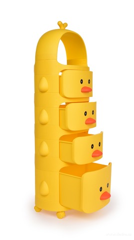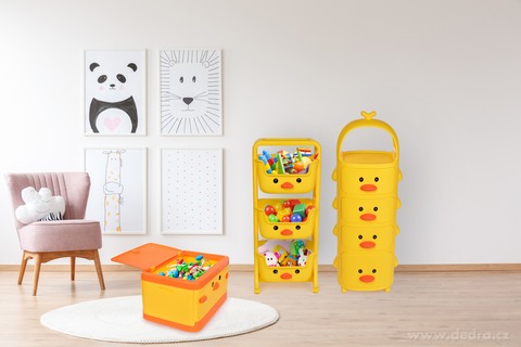 Roztomilý dětský regál KAČENKA se 4 prostornými šuplíky a kolečky. Barevný úložný box ve tvaru kačenky na hračky, plyšáky, kostky i oblečení. Výška 117 cm, odolný plast, snadné přemístění a motivace k uklízení.