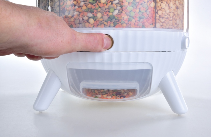 Praktický otočný dávkovač GOURMET 360° se 6 zásobníky (až 6 kg) na sypké potraviny umožňuje skladovat rýži, luštěniny či obiloviny bez obalů. Každá komora má vlastní dávkovací tlačítko, udržuje potraviny čerstvé a kuchyň přehlednou.