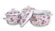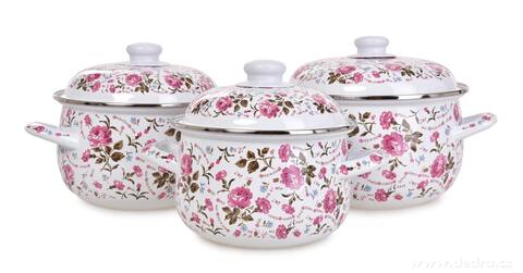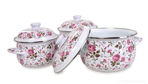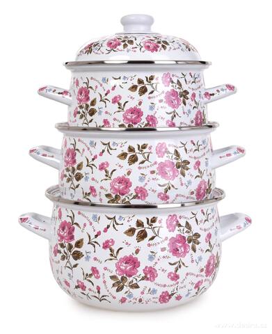 6 dílná sada smaltovaných hrnců s poklicemi. S květinovým motivem.