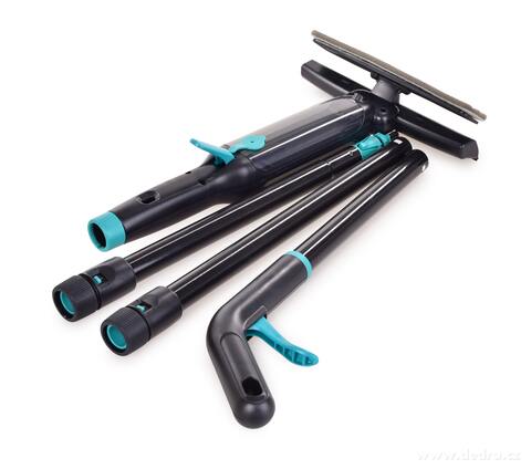 4v1 stěrka WINDOW & SOLAR s rozprašovačem, teleskopickou rukojetí až 150 cm a vyměnitelnou stírací plochou. Čistí vysoká okna, zimní zahrady i solární panely bez žebříku. Utěrka z mikrovlákna, výkyvná hlavice a dvě nádrže na vodu.