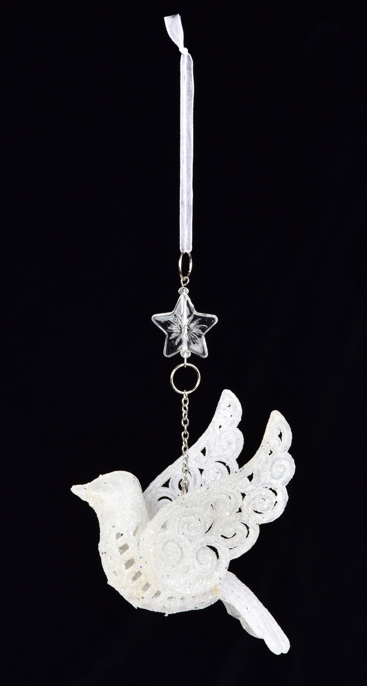 Její filigránově propracovaná křídla v 3D plastickém provedení vytvářejí iluzi jemného peří pokrytého jinovatkou. Povrch s glitrovým třpytem pod světly stromku či svíček připomíná ojíněný sníh. Ozdoba je navíc doplněna průhlednou hvězdičkou a stužkou na zavěšení, takže ji snadno umístíte na stromek, věnec i do zimních aranžmá.