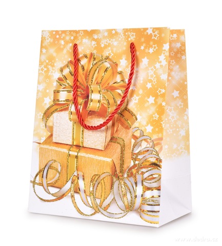 Luxusní dárková taška velikosti M s motivem zlatých dárků a jemným třpytivým zdobením. Elegantní volba pro výjimečné příležitosti. Zpevněné uši a kvalitní zpracování.