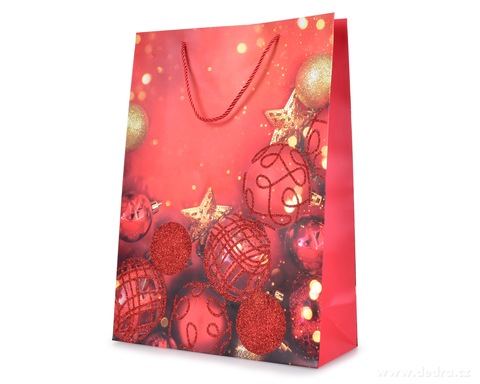 Elegantní dárková taška velikosti M s motivem červených vánočních koulí a zlatými třpytkami. Pevné kartonové provedení s provázkem pro pohodlné přenášení. Vhodná na velké dárky.