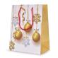 Malá dárková taška s motivem zelených vánočních koulí, svíček a dekorací, zdobená zlatými třpytkami. Pevný karton, provázkové ucho, rozměry 18 × 10 × 23 cm. Elegantní balení pro malé dárky.