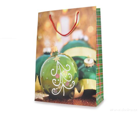 Velkoformátová dárková taška se svátečním motivem zelených koulí a svíček. Zdobená zlatými třpytkami, s červeným provázkovým uchem. Rozměry 30 × 12 × 41 cm. Vhodná pro větší a objemnější dárky.