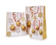 Elegantní dárková taška XL s motivem zlatých koulí, spirál a sněhových vloček na bílém pozadí. Zdobená zlatými třpytkami. Ideální na objemné dárky. Rozměry: 30 × 12 × 41 cm.