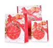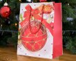 Dárková taška ve velikosti M s motivem červené vánoční koule ozdobené zlatými třpytkami a saténovou mašlí. Bílé pozadí s jemnými puntíky dotváří slavnostní atmosféru. Rozměry 18 × 10 × 23 cm.
