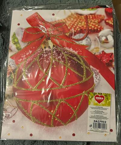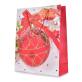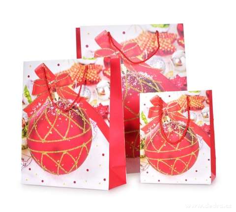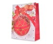 Dárková taška s dominantní červenou vánoční koulí a zlatou mašlí, zvýrazněná třpytkami. Bílé pozadí s puntíky dodává zimní nádech. Velikost L – ideální na větší dárky. Rozměry: 26 × 10 × 32 cm.