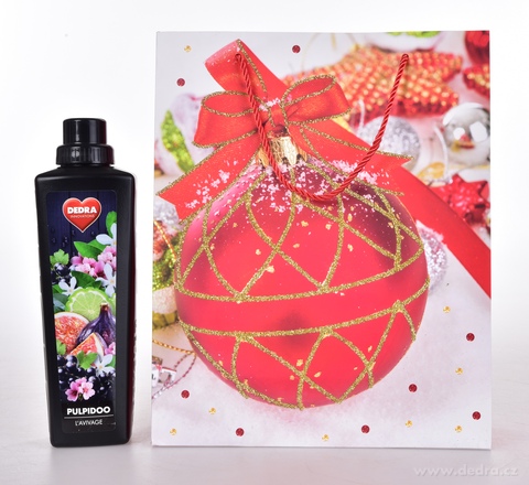 Elegantní dárková taška, která se postará o první dojem dárku. Hlavní motiv tvoří výrazná červená vánoční koule se zlatými detaily a saténovou mašlí. Koule je zasazená do slavnostní zimní scény na bílém pozadí s jemnými červenými a zlatými puntíky. Celý motiv je zdoben zlatými třpytkami, které dodají balení luxusní a jiskřivý vzhled.