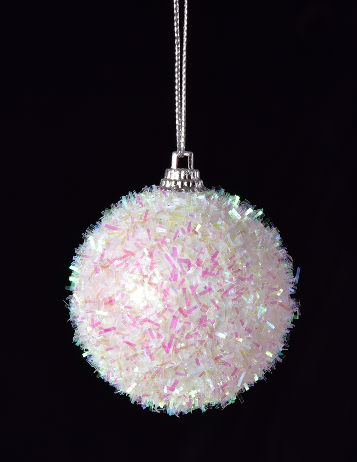 KRYSTALOVÝ SNĚHOVĚJ – jako by se v kouli ukrývala samotná zimní pohádka. Jemné perleťové lametky a drobné třpytky vytvářejí efekt ojíněného sněhu s duhovým leskem, který oživí každou větvičku stromku či sváteční aranžmá.