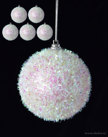 Sada 6 sněhobílých koulí KRYSTALOVÝ SNĚHOVĚJ s perleťovými lametkami a třpytkami. Ø 7,5 cm. Zářivé ozdoby s efektem čerstvě napadaného sněhu a duhovými odlesky pro luxusní vánoční výzdobu.