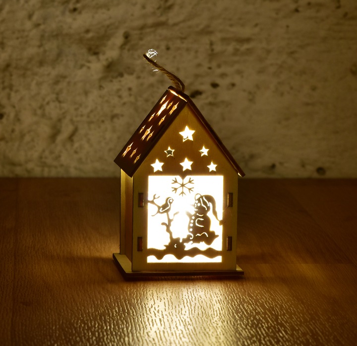 Pokud milujete kouzlo Vánoc v přírodních tónech, tento dřevěný domeček je pro vás jako stvořený. Uvnitř se mihotá teplé LED světlo připomínající plamínek a v okénku se usmívá sněhulák s ptáčkem.